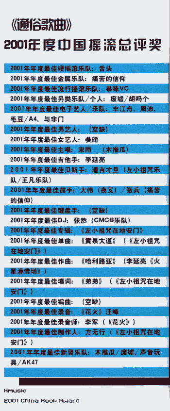 《通俗歌曲》2001年度中国摇滚十大唱片