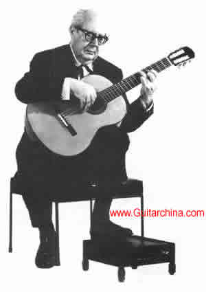 塞戈维亚在演奏时所采用的持琴姿势,可以保证乐器最大的稳定性,同时又可以使双手自如地移动,非常放松而又不失准确和完善。他坐在一个没有靠背的椅子的前端,身体稍向前倾,琴的面板与地面基本垂直,这样他只能看到指板的边缘和第六弦,如果需要看到整个指板,则只是稍向前探头而不用改变吉他的位置。塞戈维亚使用的是一个扁平的脚凳(大约5一6英寸高),置于椅子左前方。他左脚的前脚掌踩在脚凳的近端边缘,脚后跟悬空(如图1、2),这种姿势可以使左脚和左腿有一定的活动余地。他的右脚放在椅子右边靠外一点的地方,比左脚稍靠后一点,用右脚趾和脚趾的根部支撑右腿,而不把脚放平。这样一来,吉他便获得了四个支撑点:右腿大腿部、左腿大腿部、右臂前部和胸部。琴身向内弯曲的凹陷部放在左腿上。右臂的前臂放在琴身最宽的部分,让前臂完全处于放松的悬垂状态。你可以以胳膊时为支点,用钟摆式的动作去检查你右臂的姿势是否正确,此时右臂的肌肉不应有任何的紧张感。如果你能做到上述这些要求,那么你的姿势就应该说是正确的,而且相对于琴弦来讲,你可以使右手取得一种最佳的演奏姿势(图3)。